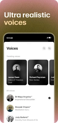 Experience audiobooks like never before. ElevenReader lets you hear classics and new releases narrated by legendary voices — from Burt Reynolds, Judy Garland, James Dean, and Maya Angelou to Deepak Chopra and Richard Feynman. This is AI audio at its most magical — natural, inspiring, and dream like.