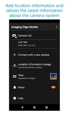 Imaging Edge Mobile allows images/videos to be transferred to a smartphone/tablet, enables remote shooting, and provides location information to images captured by a camera.