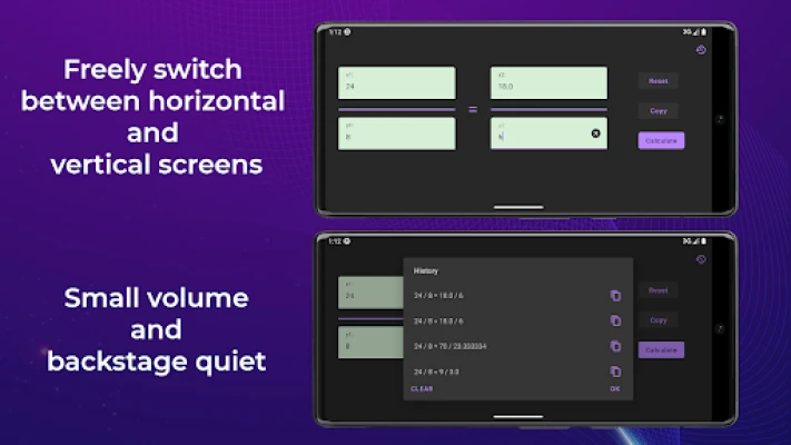 1. Dark design, beautiful and eye-friendly, takes up very little storage space, does not require any permissions, and does not require networking. 2. It supports arbitrary horizontal and vertical screen rotation, and supports viewing historical record data. Ratio calculator Easy calculat ratio.