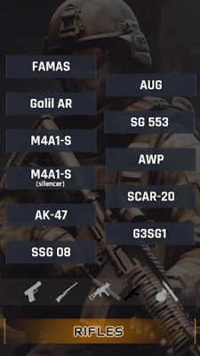 - CS and CS: GO Pistols; - CS and CS: GO Heavy Weapons; - CS and CS: GO SMGs; - CS and CS: GO Rifles; - CS and CS: GO Grenades / Knives / C4;
